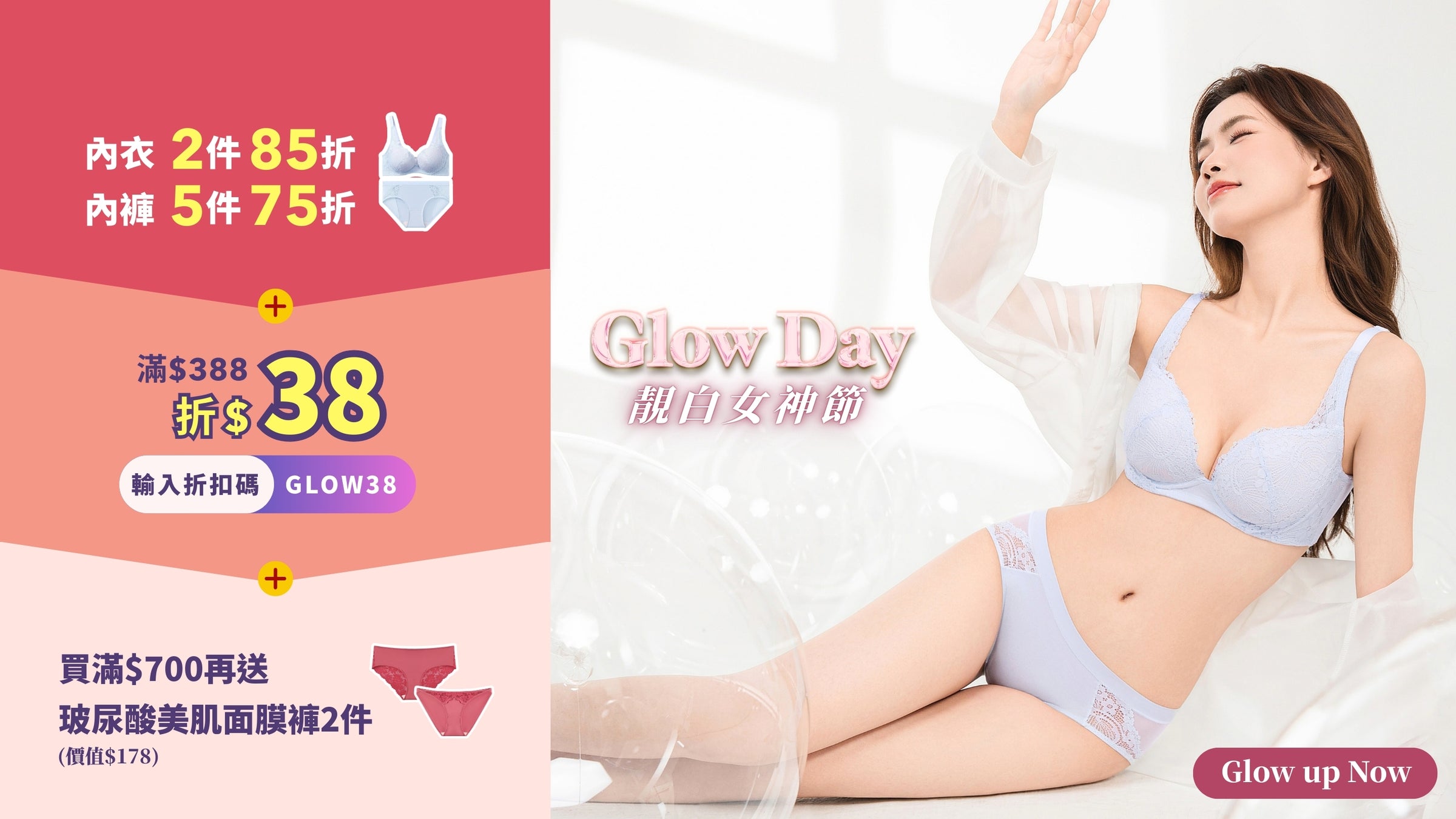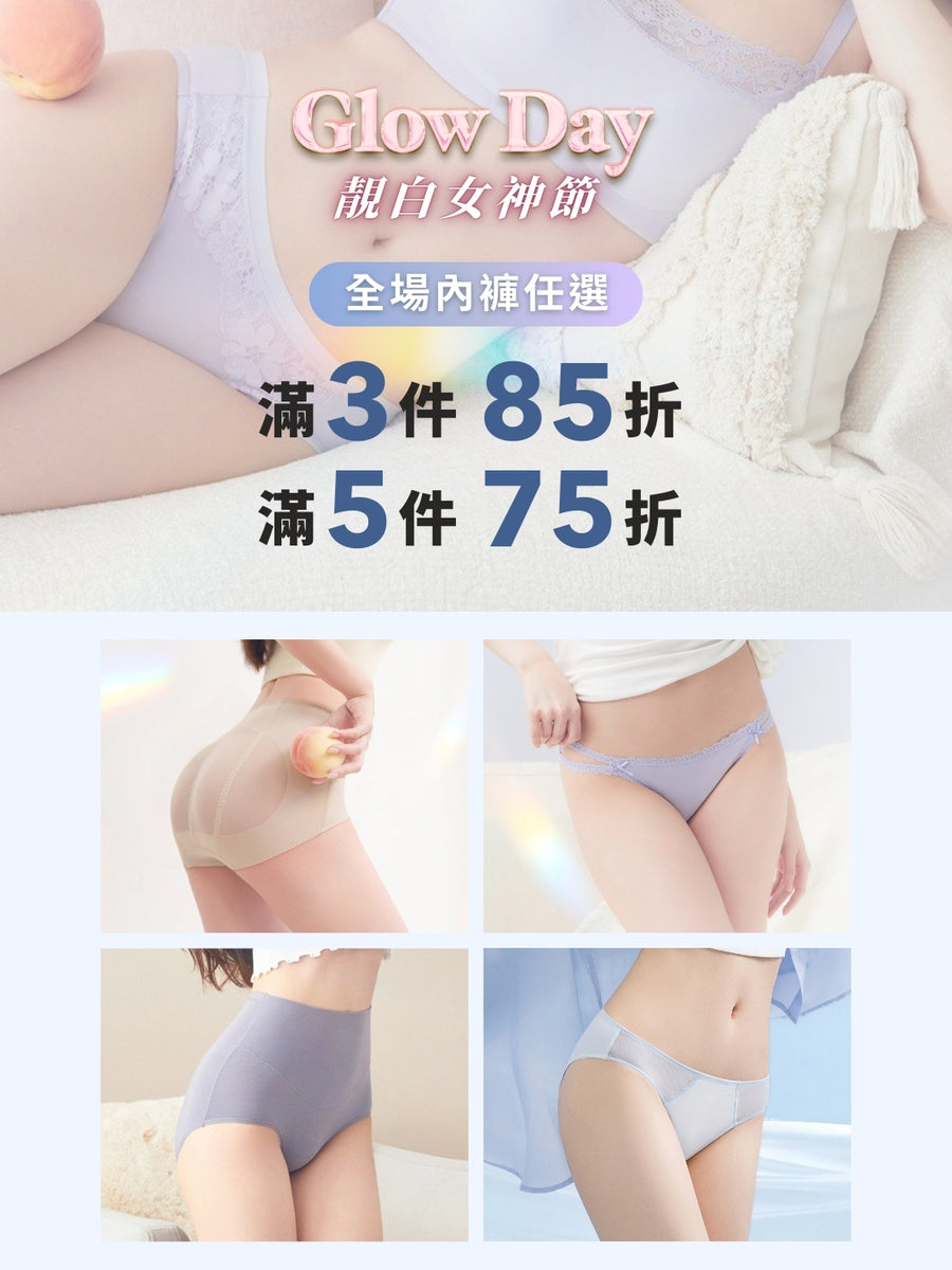 買滿$388 輸入「GLOW38」即減$38內睡衣系列任選1件9折|2件85折內褲系列任選3件85折|5件75折買滿$700即送玻尿酸美肌面膜內褲2件 (需按指示自行加入購物車,數量有限,送完即止!)