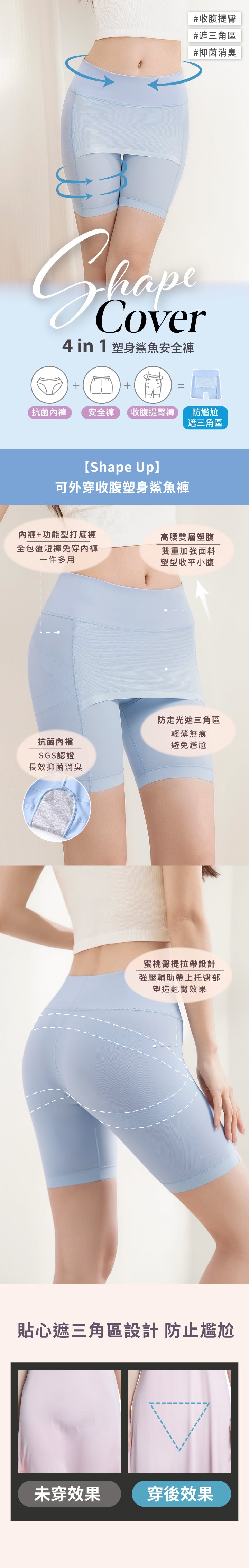4. 防走光遮三角區設計:前中輕薄無痕全遮三角區設計,避免尷尬,可作外穿短褲、居家褲或打底褲,輕鬆應對各種場合。