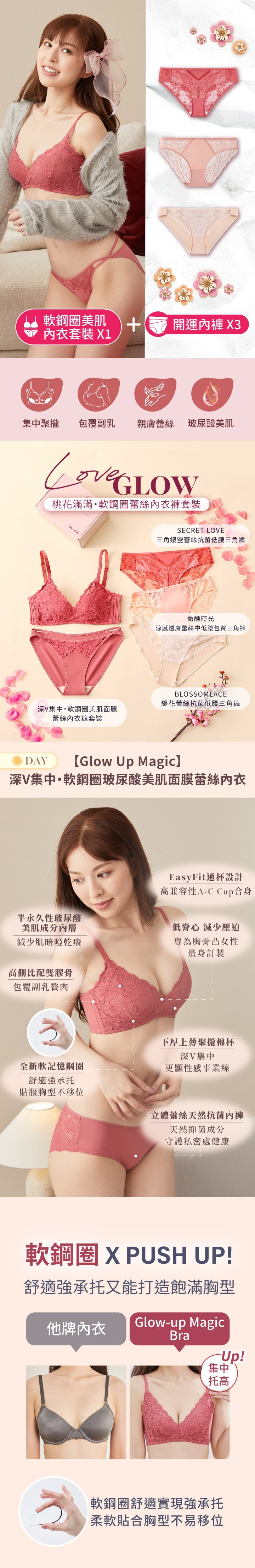 【Glow Up Magic】深V集中・軟鋼圈玻尿酸美肌面膜蕾絲內衣褲套裝特點包括: