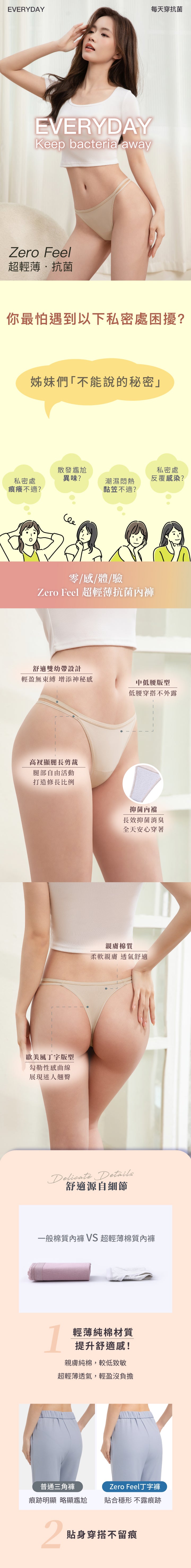 【每天抗菌4件裝】Zero Feel 超輕薄抗菌棉質中低腰丁字褲